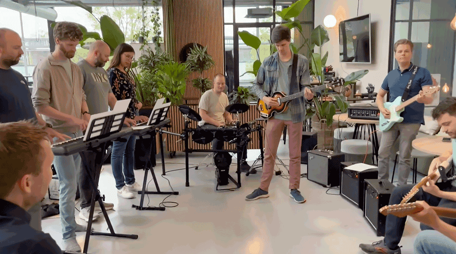 Wij verzorgen muzikale teambuilding workshops. Perfect geschikt als teambuilding activiteit, bedrijfsuitje en voor evenementen. Speel samen met je collega’s in een band en ervaar de verbindende kracht van muziek. Ervaring met het bespelen van een instrument is niet nodig! 🎸